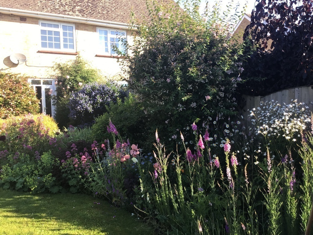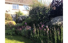 We have a lovely sunny garden with pond which backs on to fields and two patio areas for sitting and eating outside together with a summerhouse with electricity, heating and lighting.