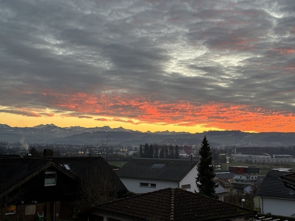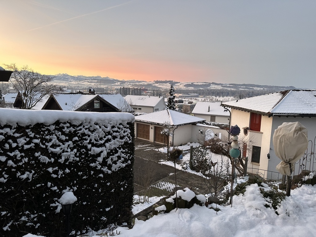 We live in a rural village with a population of 3000. From our house you can see part of the valley we belong to and quite a few lovely peaks (Eiger, Jungfrau, Titlis, Pilatus) of the Swiss Alps.