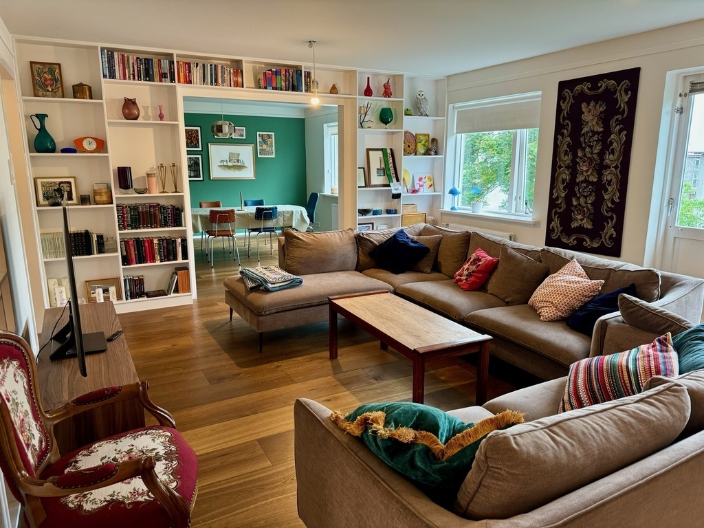 - Spacious living room with a couch, flatscreen TV and a good family table for meals