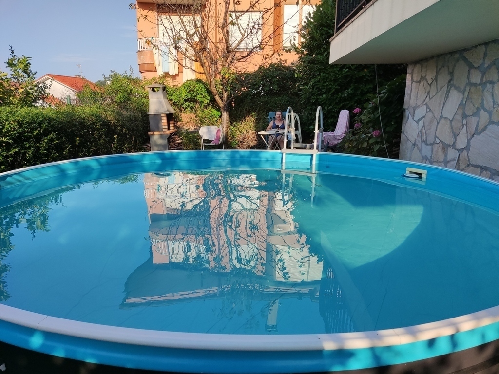 In the garden there is a little swimming pool and a barbecue