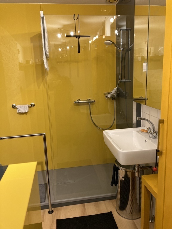 The livingroom is spacious, the furniture is colourful, Dutch design. There is a shower, a sink and a washingmachine in the bathroom. It was recently renovated.The kitchen is also new.The toilet is 'Japanese'.