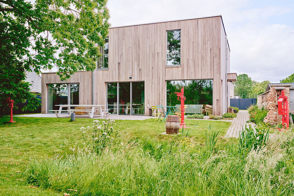 We offer you our new holiday home, Limonadefabriek Flora for your holiday. On the site where our family once brewed lemonade (1911-1983, there now is holiday house for 12 people located in the peaceful village of Overmere, East Flanders. It’s a bright, spacious and characterful family house, combining historic charm with modern comfort.There are 5 bedrooms, each with a private bathroom. The ground floor (1 bed-- & bathroom) is adjusted for people in a wheelchair.