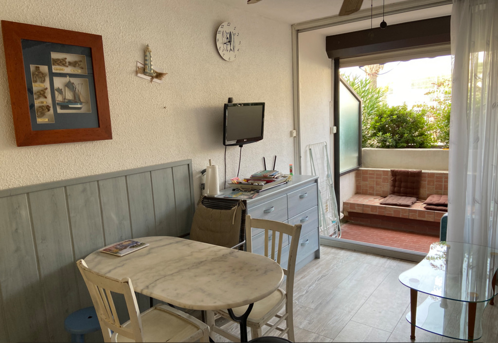 We offer our holiday apartment, located in Grau du Roi, in addition to our main residence in Redessan. This is a double cabin studio with two single bunk beds and a double bed (no closed bedroom). The studio is part of a secure residence with swimming pool and paddling pool for children, from which cycle paths lead to Espiguette beach or Aigues-Mortes. Close to the funfair and the Seaquarium, and the beach 10 minutes walk.