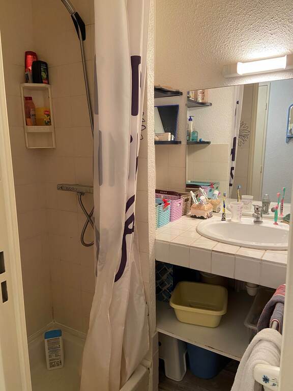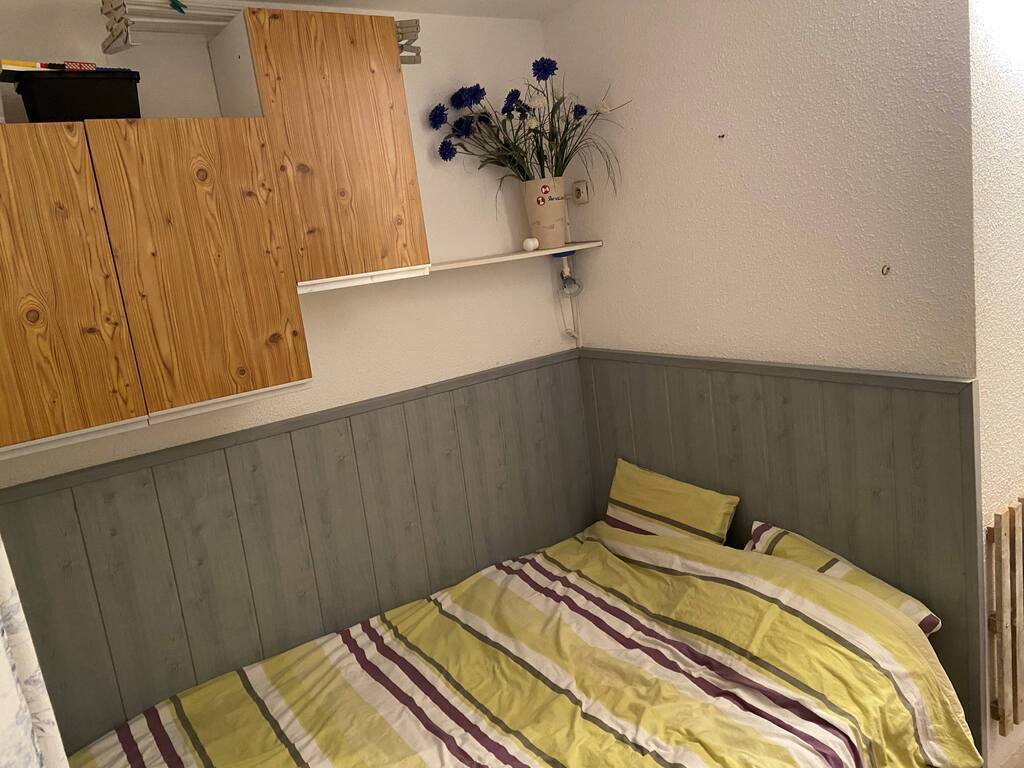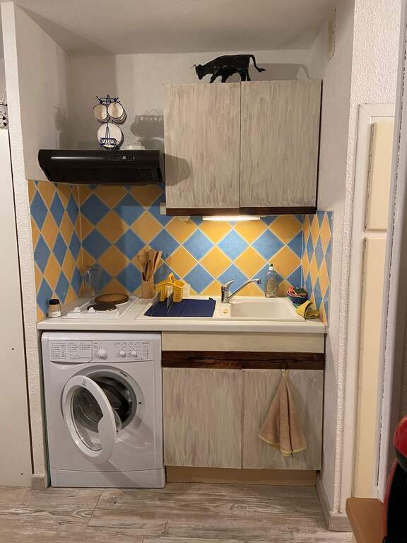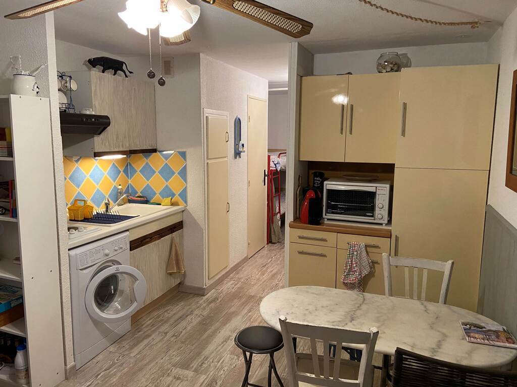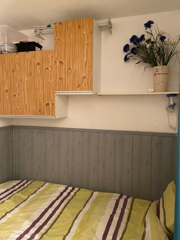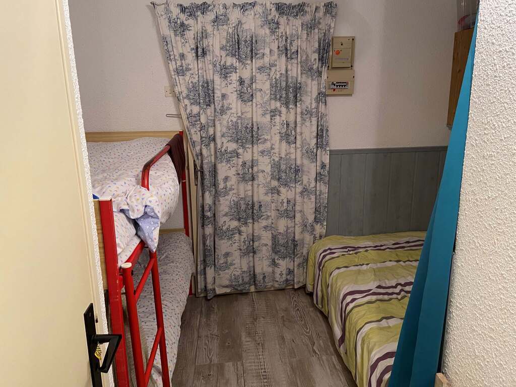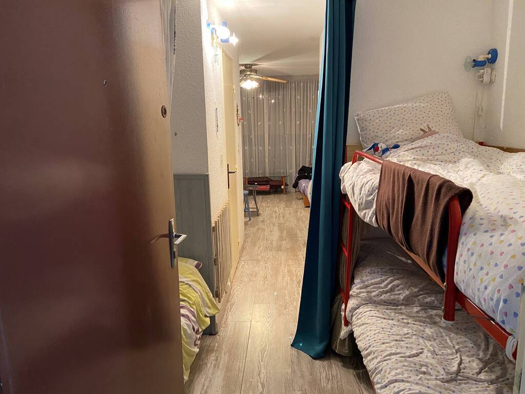 Notre studio double cabine de 23 m² se compose d'un espace nuit avec 2 lits simples superposés (90cmx190cm) et un lit double (140cmx190cm). L'espace nuit est séparé par un rideau et un couloir de l'espace séjour-cuisine. Dans le couloir se trouve une salle d'eau avec un lavabo et une douche. Il y a un wc séparé en face.