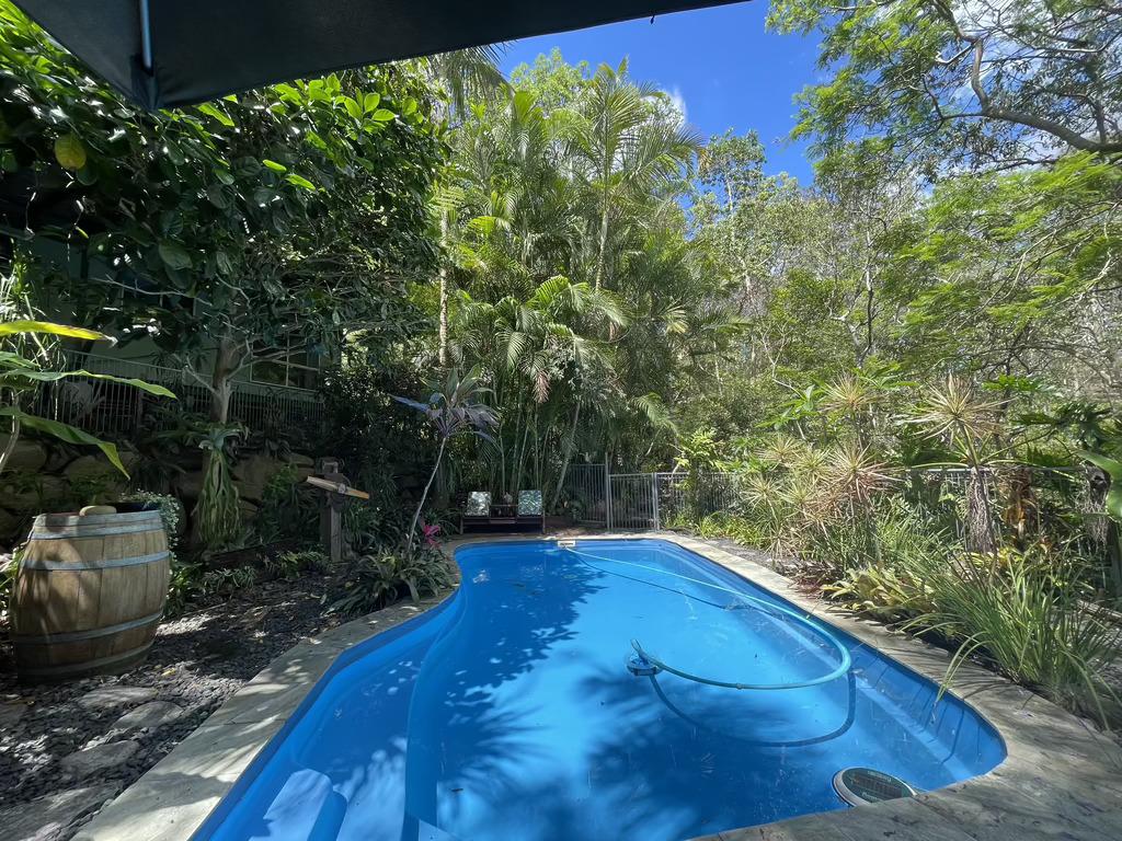 Our home is a three level house on a large block, with verandas at the front and back. It has complete privacy, being surrounded by an extensive tropical garden with winding footpaths, and lovely spaces and a swimming pool where you can relax and enjoy a lush natural environment which is home to a variety of birds and animals, many of whom visit us on our verandas.