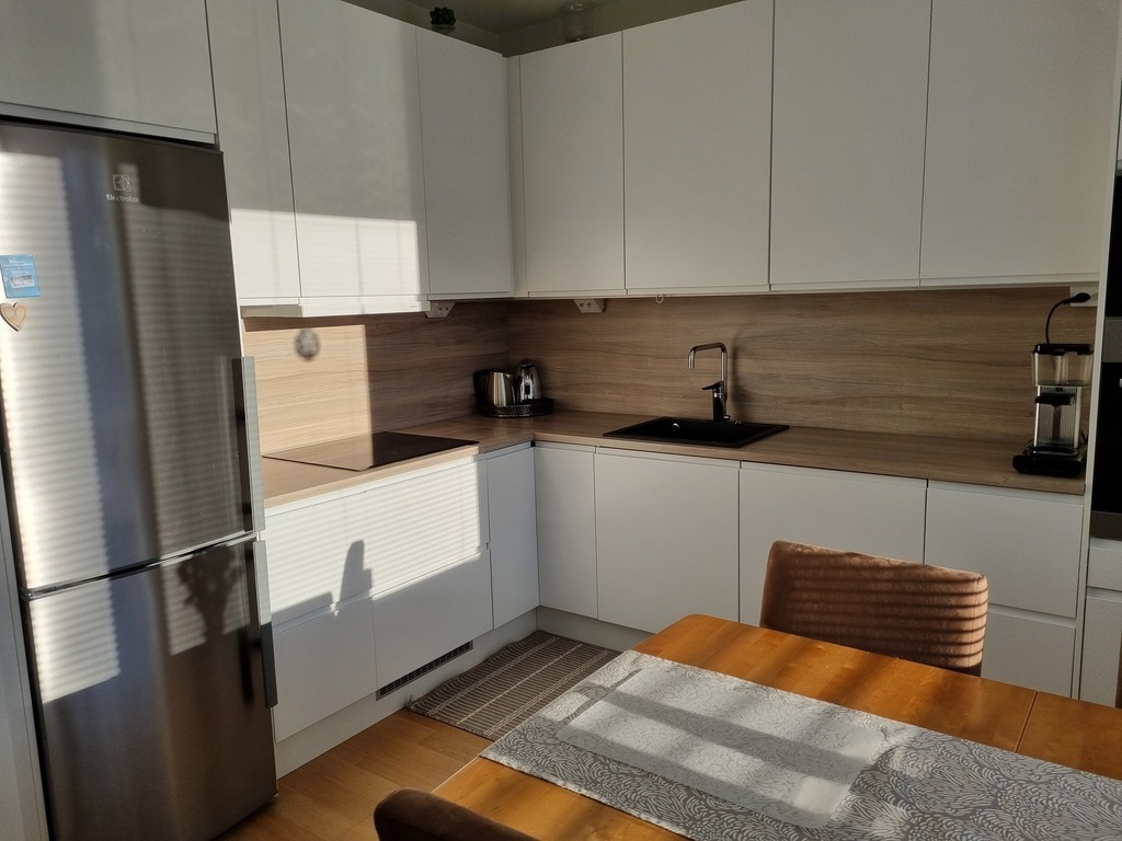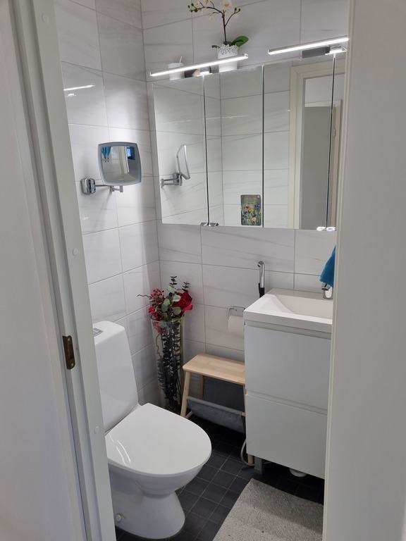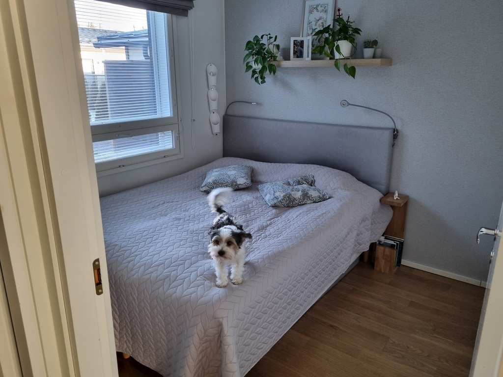 This is a terraced house with a garden and a nice patio. We have two bedrooms, open kitchen and livingroom, a toilet, a bathroom with toilet and sauna. We have one e-bike and one bike which can be used here.