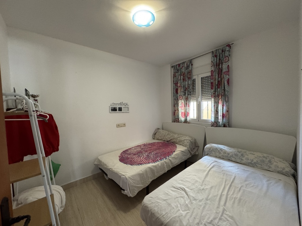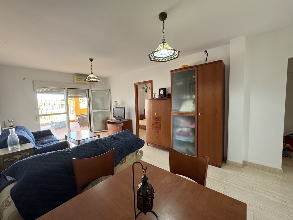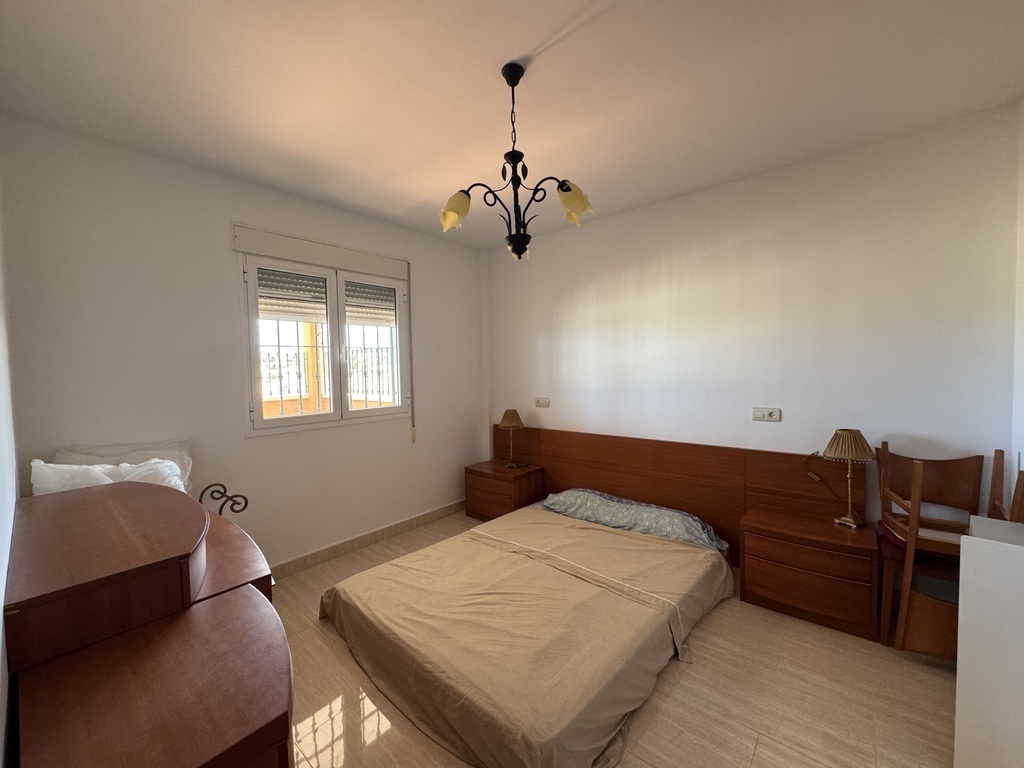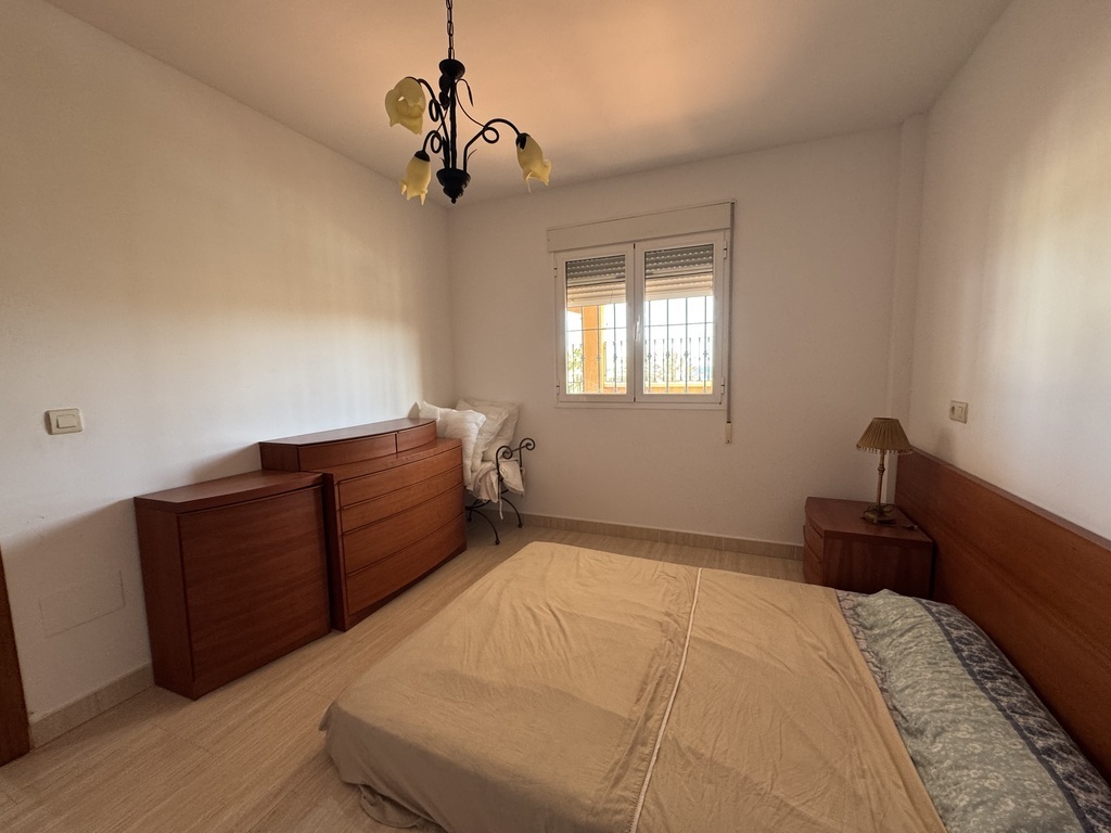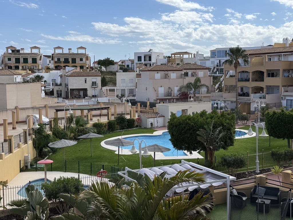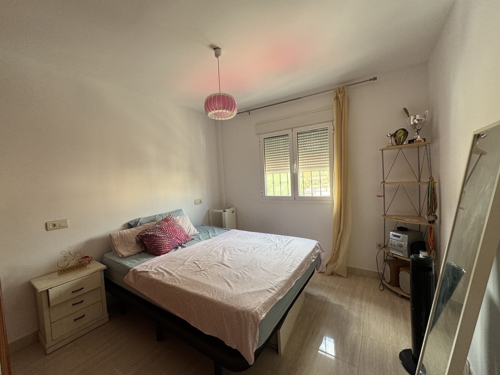Vivienda situada en una urbanización cerrada, en el centro una piscina para adultos y una piscina para niños. El apartamento esta en la primera planta sin ascensor. Al abrir la puerta principal a mano derecha tenemos un dormitorio doble con dos camas, a mano izquierda un segundo dormitorio, a continuación un baño completo con ducha, y al frente tenemos una cocina equipada y con lavadero, volviendo al pasillo llegamos al salon comedor, con acceso a un tercer dormitorio grande y con salida a una gran terraza cubierta, donde se puede ver los jardines de la urbanización las piscinas y el mar. Dispone de dos plazas de garaje cubiertas. La zona es un pequeño paraíso, llamado San Juan de los Terreros y pertenece al pueblo de Pulpi, dispone de buenos restaurantes, bares, heladerías, playas….., se llega a la playa y a los bares en menos de tres minutos andando.