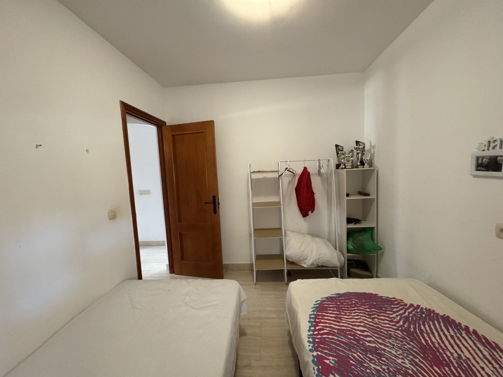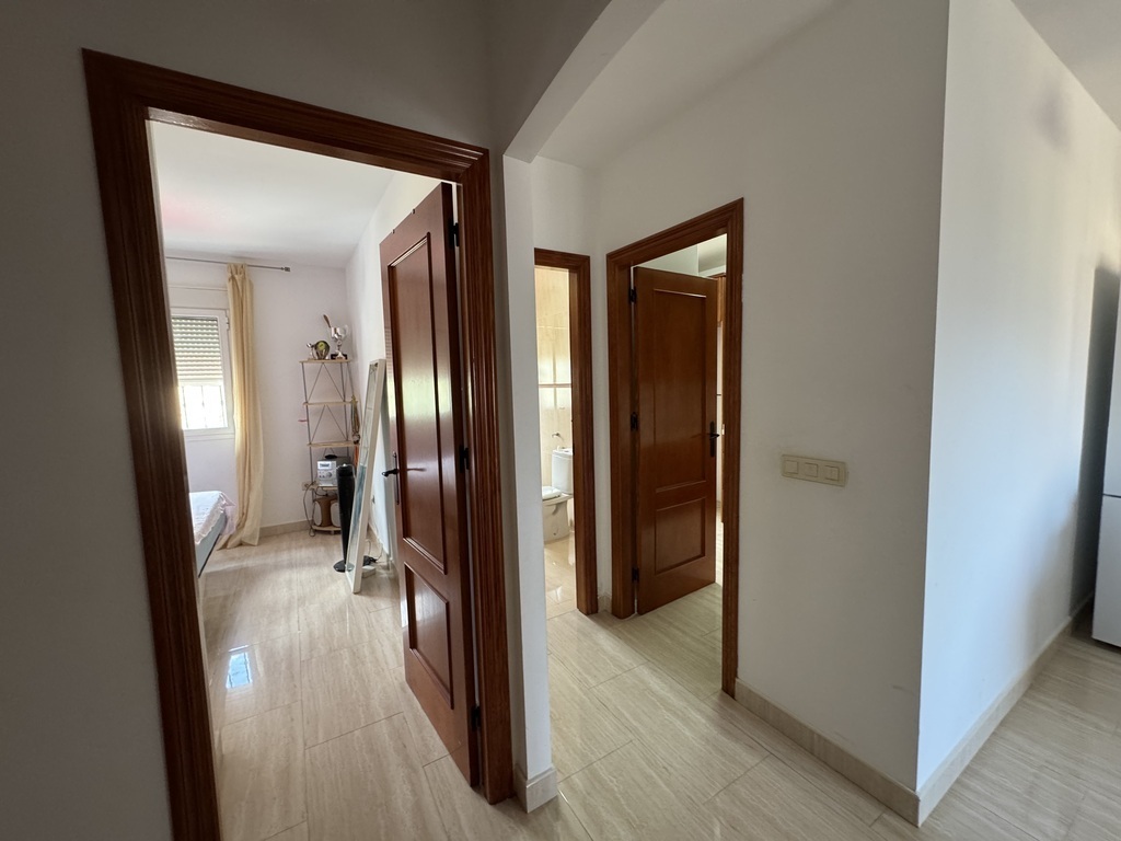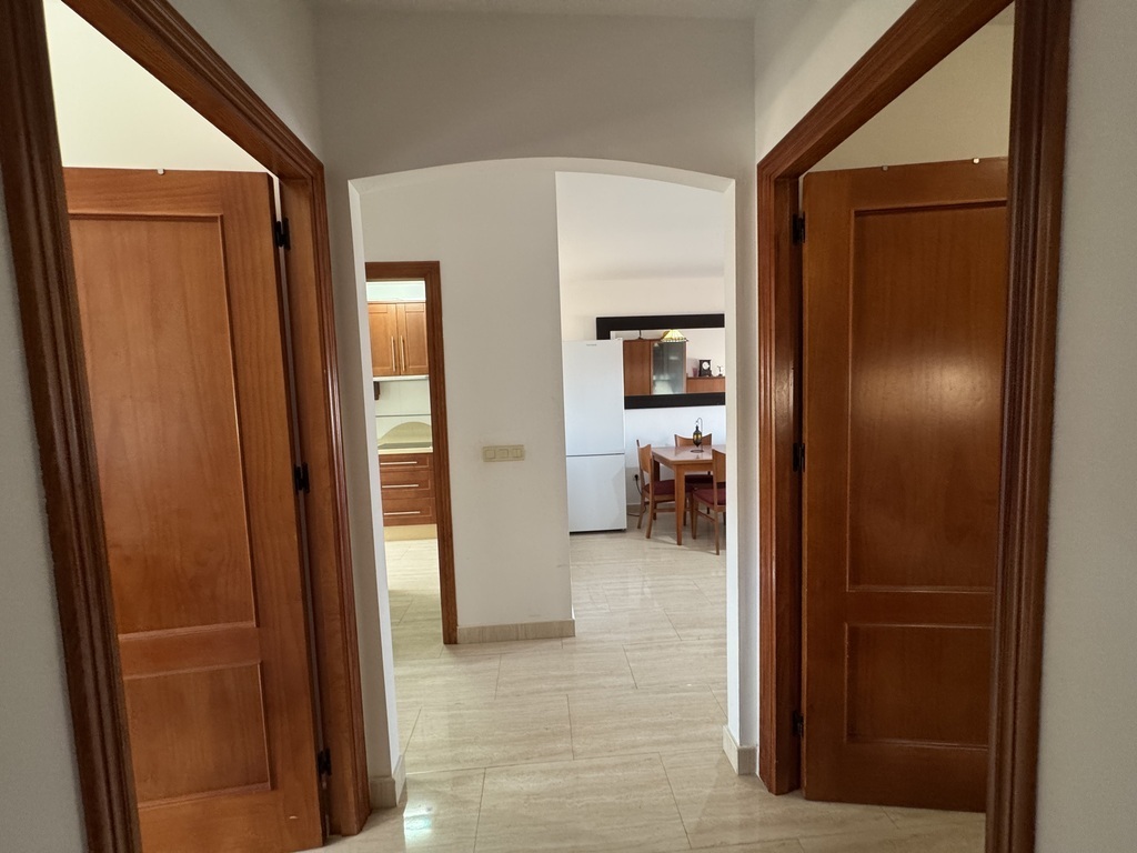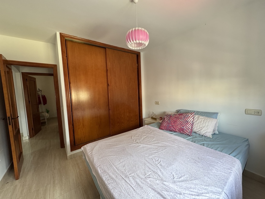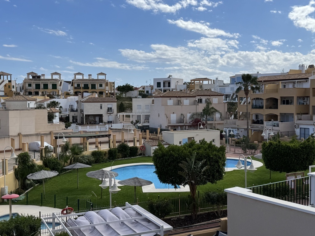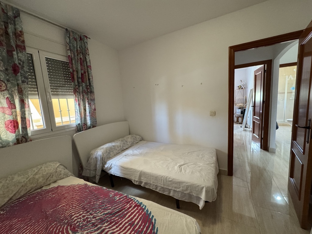 Vivienda situada en una urbanización cerrada, en el centro una piscina para adultos y una piscina para niños. El apartamento esta en la primera planta sin ascensor. Al abrir la puerta principal a mano derecha tenemos un dormitorio doble con dos camas, a mano izquierda un segundo dormitorio, a continuación un baño completo con ducha, y al frente tenemos una cocina equipada y con lavadero, volviendo al pasillo llegamos al salon comedor, con acceso a un tercer dormitorio grande y con salida a una gran terraza cubierta, donde se puede ver los jardines de la urbanización las piscinas y el mar. Dispone de dos plazas de garaje cubiertas. La zona es un pequeño paraíso, llamado San Juan de los Terreros y pertenece al pueblo de Pulpi, dispone de buenos restaurantes, bares, heladerías, playas….., se llega a la playa y a los bares en menos de tres minutos andando.