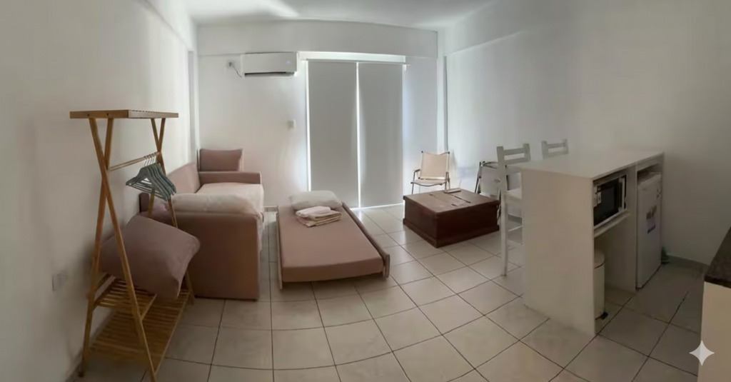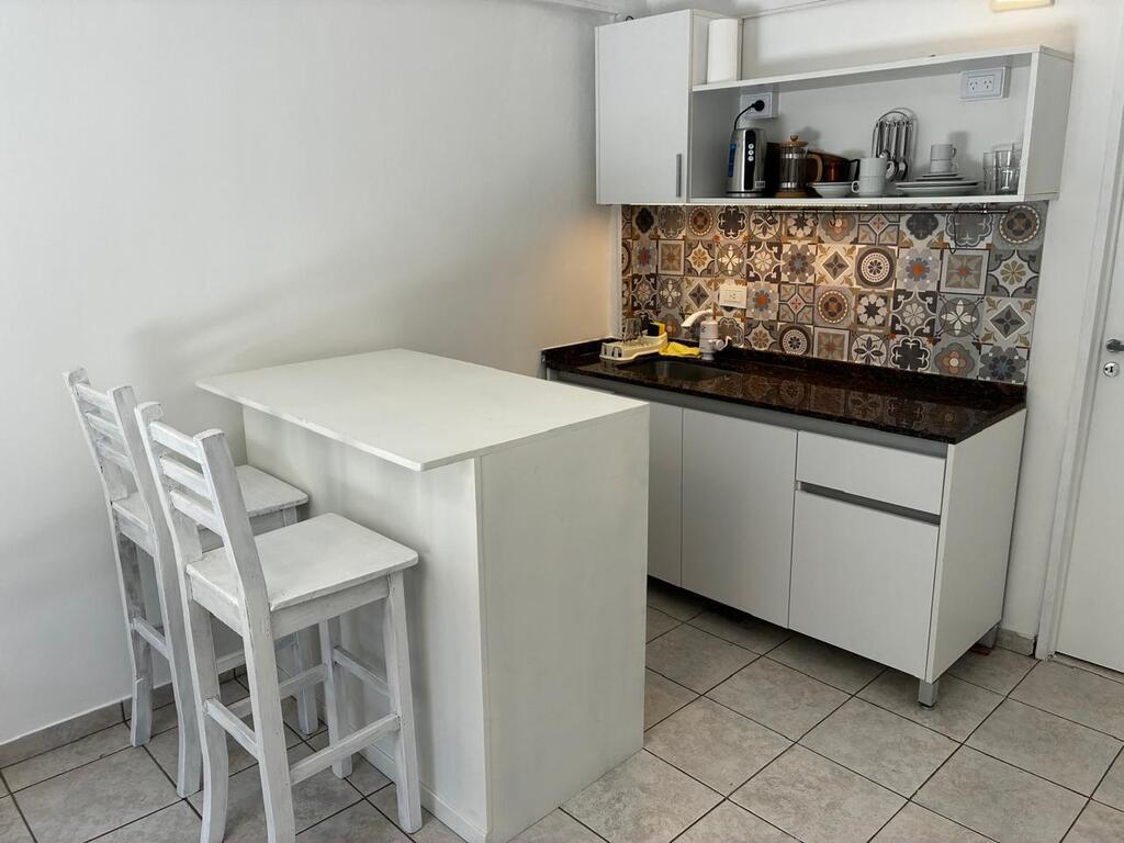 Ambientes: Cocina totalmente equipada con barra funcional, baño moderno con mampara y un área de estar con sofá cama (para 2 personas).