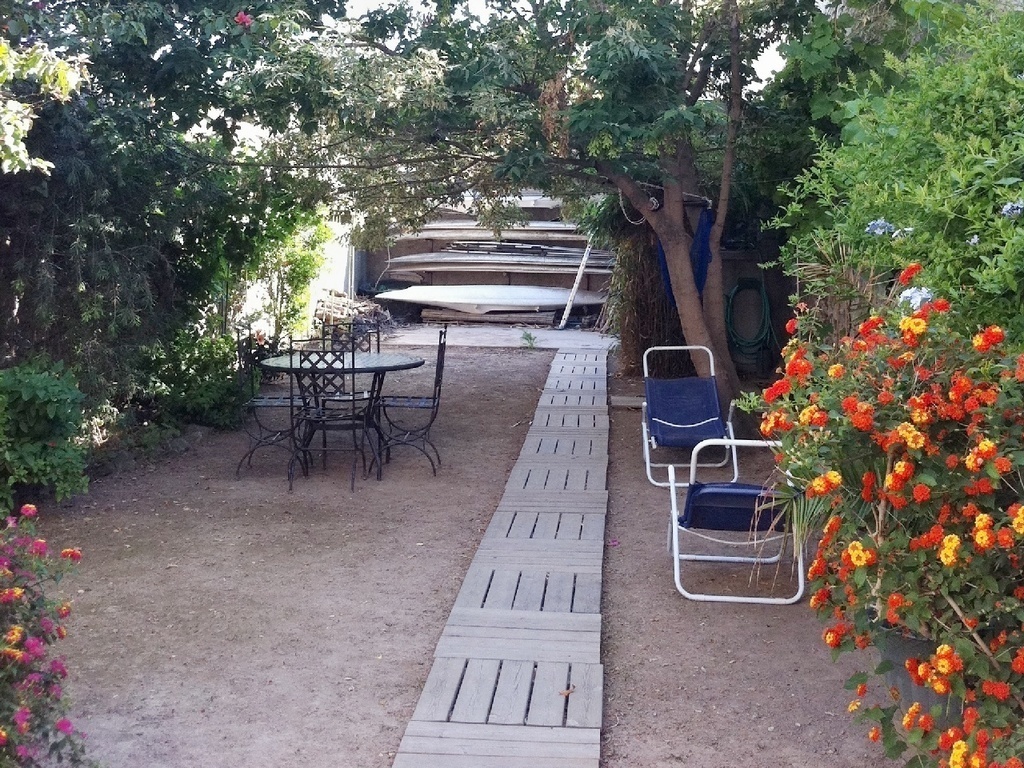 The garden is surrounded by high stone walls and finishes with a second terrasse (barbecue, outside shower) and a large garage (40m2) which opens onto a calmer road than the one which is parallel to the entry channel to the port. In the garage you will find boards for windsurfing, 2 sea kayaks, 4 bikes, a ping-pong table...