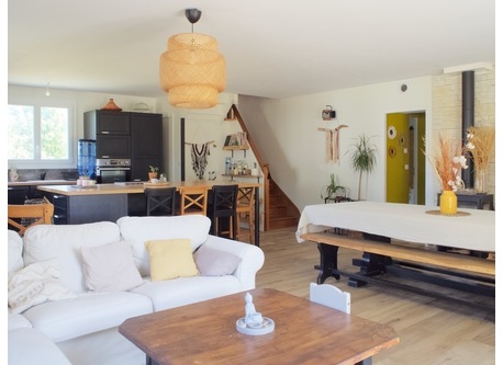 Au rez de chaussée : grande cuisine équipée type « américaine » avec coin repas ; séjour; salon d'été(véranda) ; salle de bain ( lave linge, sèche linge, douche, lavabo ) ; wc ; 1 chambre bureau.